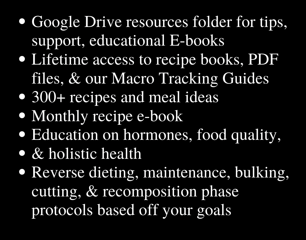 On top of weekly check-ins with your coach for protocol adjustments, accountability, and support, you will have 24/7 contact with your coach through WhatsApp. You’re given your coach’s number for whenever you need it: help with tracking, a little hype, questions, help with planning ahead or tracking food at restaurants, anything and everything! Our community group chat is also an amazing source of support and hype!